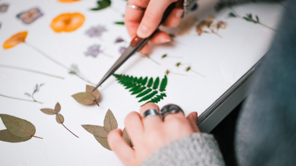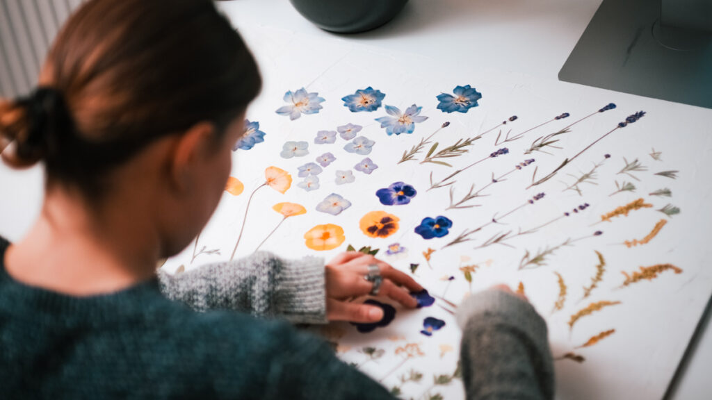 Taimed kuivatatakse ja pressitakse kuni 6 nädala jooksul ning seejärel loon kavandid, mille hulgast valid meelepärase. See on teadlikult rahulik protsess, kus ilu vajab aega.