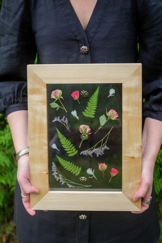 Esmalt on vajalik, et sinu valitud taimed või lillebukett võimalikult värskena minuni jõuaks. Seejärel läheb materjal pressi alla, et kuivada ja võtta säilitamiseks sobiv vorm. Pressi all õhukeseks kuivanud materjali kujundan elegantseks õhuliseks kompositsiooniks ja säilitan kahe läbipaistva klaasi vahel raami sees. Nii valmibki kordumatu ja personaalne mälestusese sinule südamelähedasest ajast, kohast ja mälestusest.