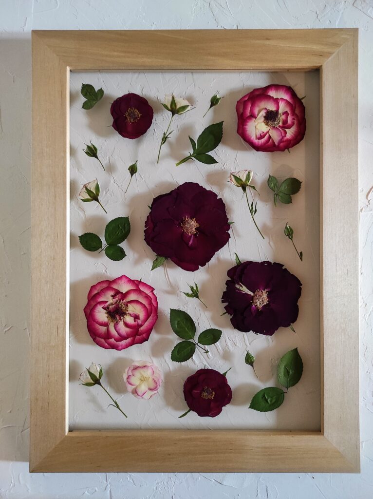 Kuigi roosid on ühed raskeimad lilled, mida pressida, siis oli ühe kliendi kindel soov luua raam roosidega kingiks oma tädile. Toonid said valitud vastavalt toa olemasolevale sisekujundusele ning minimalistliku disainiga raam aitab asetada taimeraamis esikohale eriilmelised roosid.